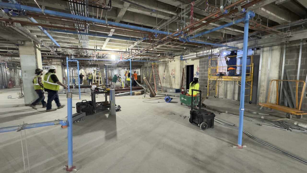 Progress continues at Lady of the Sea. Currently our team has completed the milestones of pouring the building slab and erecting steel and metal decking for Level 1, with only the mezzanine structural steel and metal decking left to be installed. The team is nearly complete with installing exterior CMU block walls with waterproofing and brick coming soon. On the roof, the team has completed three out of the seven roof slab pours. On the interior, framing interior walls and installing overhead MEP hangers is underway, as well as in-wall and overhead rough-ins, and topping out walls and fireproofing. This project is is being delivered through a CMAR process.