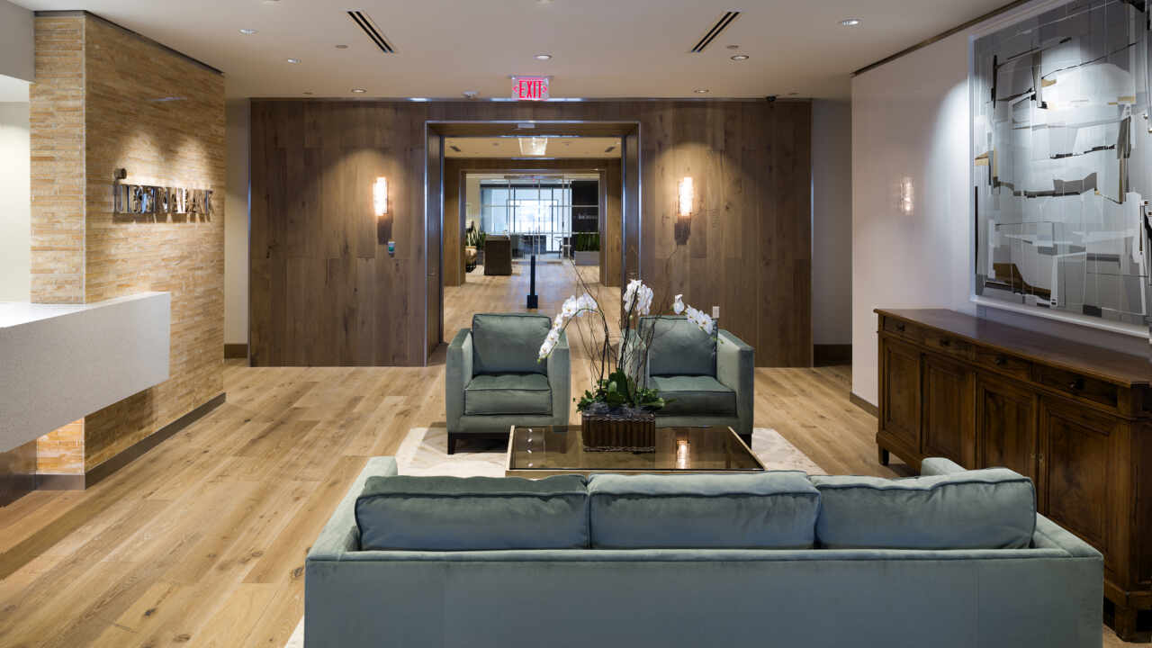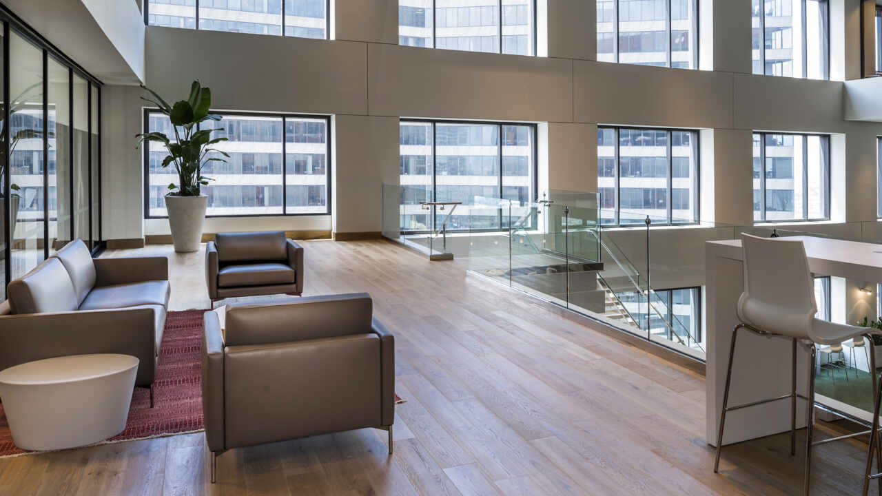 The project houses the top corporate executives and features many high-end finishes such as natural hardwood floors, marble countertops and frameless glass storefront office windows and openings. The space was fit out with extremely advanced telecommunications capabilities that had to all be coordinated and executed with precision due to the end user.