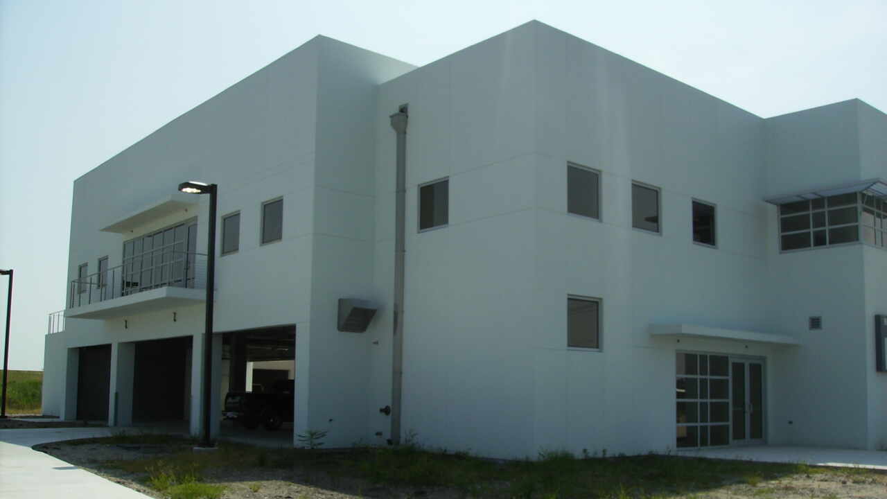 An anti-terrorist hydraulic barrier at the entry and exit gates, and one-foot-six-inches thick concrete retaining walls surrounding the building with varying heights from 4’ to 18’ above grade ballistic and hurricane impact windows and door systems.